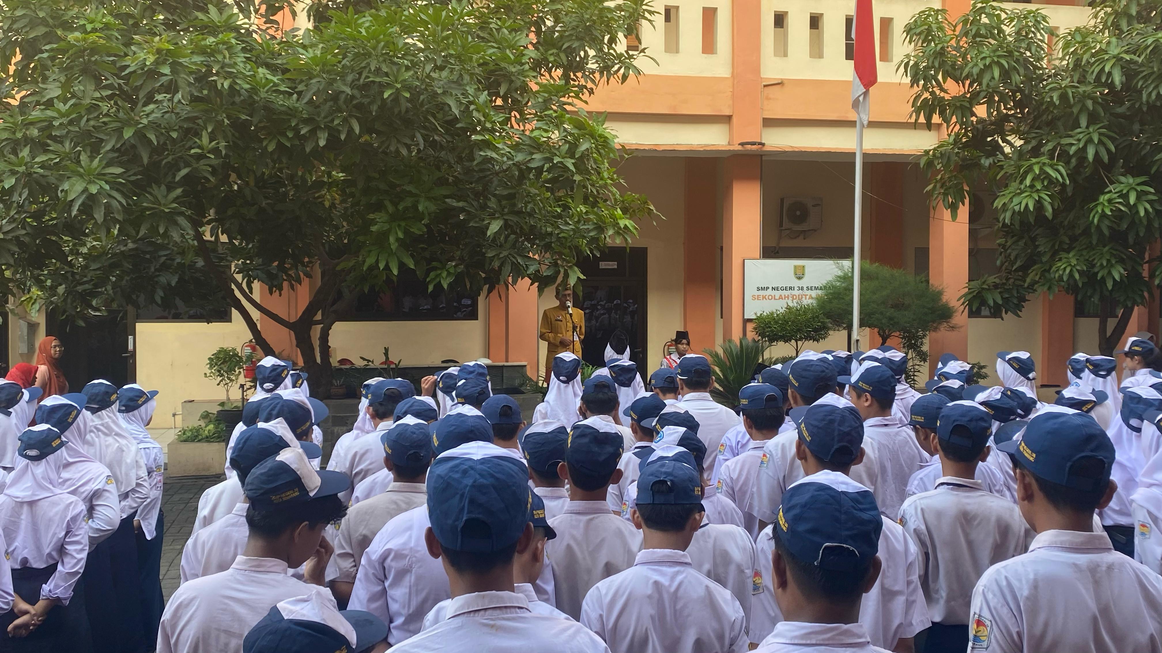 Semarang Estila - Dalam rangka memperingati HARDIKNAS yang jatuh pada tanggal 2 Mei Tahun 2025 sekolah dalam hal ini SMP Negeri 38 Semarang melaksanakan upacara sebagai wujud sebagai insan cendikia dan mengobarkan semangat nasionalisme dan pendidikan di lingkungan sekolah. Sebagai Pembina Upacara Kepala SMP Negeri 38 Semarang Bapak Drs.Slamet,M.Pd menyampaikan dalam amanatnya Hardiknas dan HUT Kota Semarang jatuh secara bersamaan sehingga kita seluruh warga sekolah turut merasakan suka dan cita dan bangga sebagai salah satu insan cendika dan warga Kota Semarang. Kemudian dalam amanatanya juga mengingatkan kita semua kepada sosok pahlawan yang berjuang di bidang pendidikan dan mencerahkan bangsa Indonesia yaitu Bapak Ki Hajar Dewantara yang dalam sasantinya terkenal dengan semboyan Ing Ngarso Sung Tuladha, Ing Madya mangun Karso, Tut Wuri Handayani. Ing Ngarsa Sung Tuladha artinya di depan memberikan contoh ketika menjadi seorang pemimpin dan menjadi panutan bagi lingkungan di sekitarnya. Ing Madya mangun Karsa mengandung pesan bahwa seorang pemimpin harus bisa memotivasi atau memberikan semangat untuk kemajuan bangsa dan negara. Tut Wuri Handayani yang memberikan pesan bahwa pemimpin juga harus bisa mendukung dan memberikan dorongan moral kepada lingkungan sekitarnya.